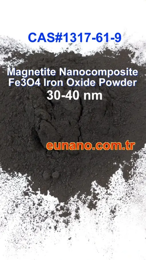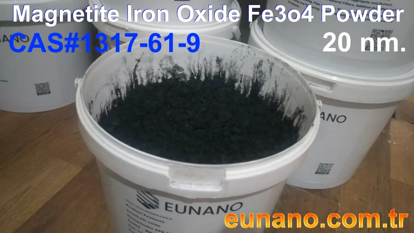 Order 5 KG of Magnetite Iron Oxide (Fe₃O₄ purity 97%) powder in black color, 20 nm microscopic particle size, from our existing stocks on our EUNANO.com.tr website for use in industrial production.
